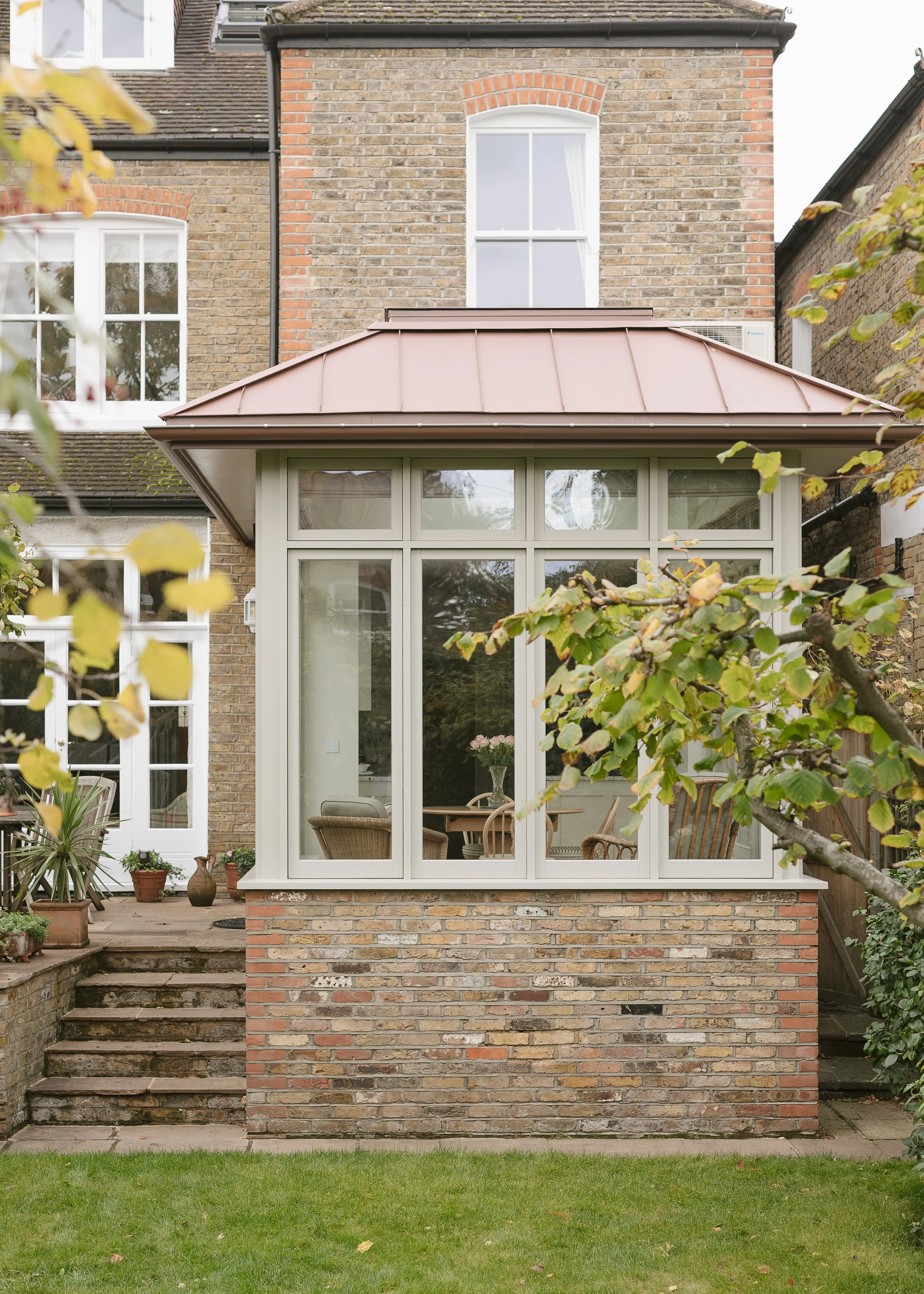 This project includes the replacement of an existing conservatory and internal refurbishment throughout, to a semi-detached Victorian house in Wandsworth. The new design features a pigmented red zinc roof and painted hardwood framed glazing, blending contemporary materials with the home's traditional character. update.